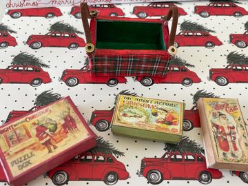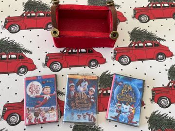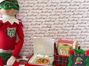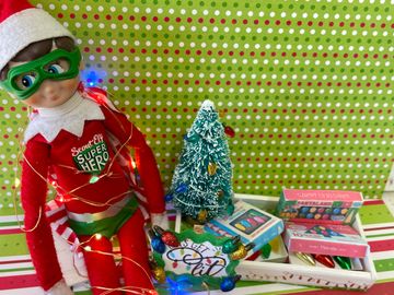 Let's Get Elf-In Lit! Collection comes with a miniature Christmas decorated wooden tray, 1 miniature Christmas tree wrapped in non working decorative lights, 3 miniature Christmas light boxes each containing 3 decorative light bulbs, 1 miniature Christmas sign, and 1 6ft 20LED battery operated Elf string of lights to wrap your elf in.